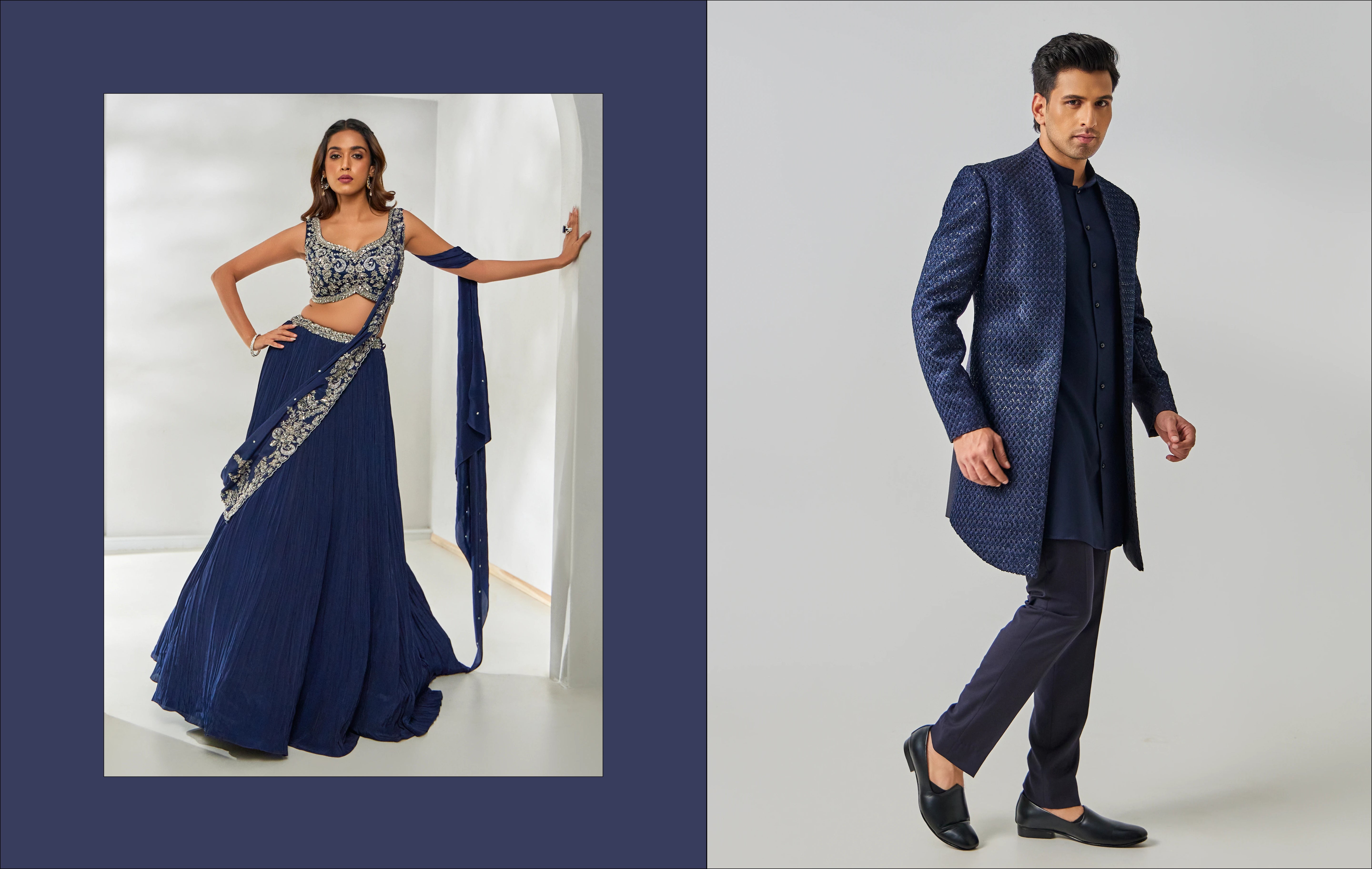 BenzerWorld presents a sophisticated collection of ethnicwear for men, combining heritage aesthetics with contemporary design. Whether you’re searching for a regal sherwani for men, an elegant Indo western dress for men, or a classic marriage dress for men, our collection is tailored to make every occasion special. For wedding celebrations, our sherwani mens wear features luxurious fabrics adorned with intricate zardozi work, resham embroidery, and fine sequin embellishments, ensuring you stand out at every sangeet and reception. For cocktail events and sundowners, our designs offer a fusion of structured silhouettes and traditional motifs, creating a refined yet modern look, including Indo western for men.