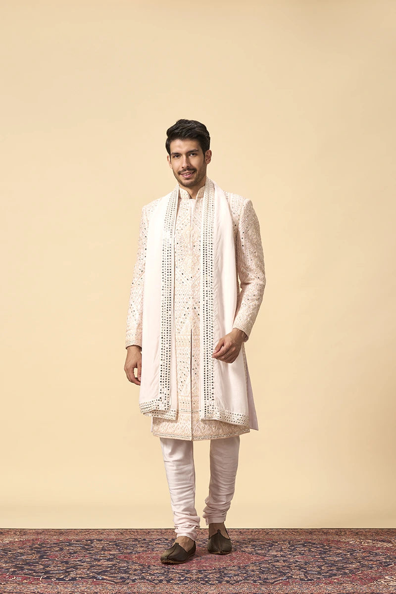 - This refined Indo-Western ensemble, crafted in premium raw silk, features intricate resham and hand-applied mirror embroidery. Paired with a cotton-silk kurta, churidar, and an embroidered shawl, it’s the perfect choice for a modern groom’s royal look.